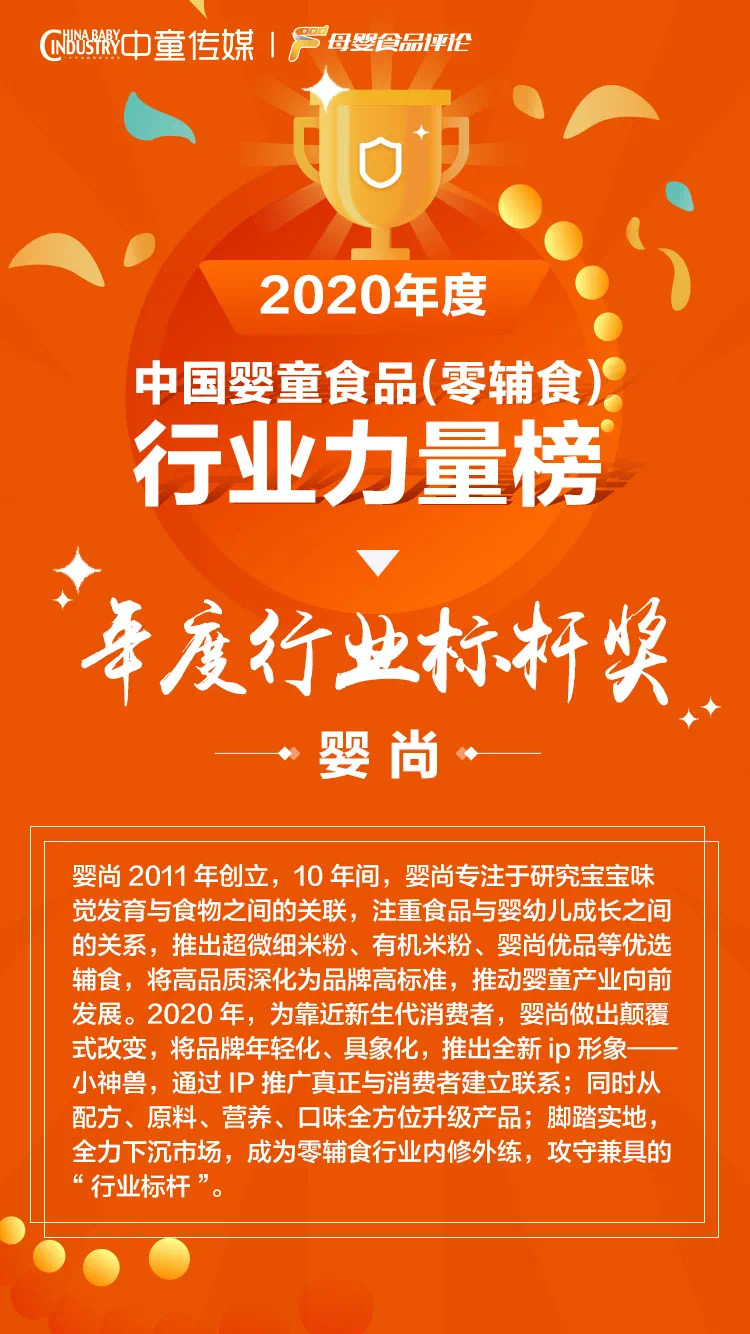 嬰尚品牌榮膺年度行業(yè)標(biāo)桿大獎。嬰尚2011年創(chuàng)立,10年間,嬰尚專注于研究寶寶味覺發(fā)育與食物之間的關(guān)聯(lián),注重食品與嬰幼兒成長之間的關(guān)系,推出超微細(xì)米粉、有機(jī)米粉、嬰尚優(yōu)品等優(yōu)選輔食,將高品質(zhì)深化為品牌高標(biāo)準(zhǔn),推動嬰童產(chǎn)業(yè)向前發(fā)展。2020年,為靠近新生代消費(fèi)者,嬰尚做出顛覆式改變,將品牌年輕化、具象化,推出全新ip形象一小神獸,通過IP推廣真正與消費(fèi)者建立聯(lián)系;同時從配方、原料、營養(yǎng)、口味全方位升級產(chǎn)品;腳踏實地,全力下沉市場,成為零輔食行業(yè)內(nèi)修外練,攻守兼具的“行業(yè)標(biāo)桿”。