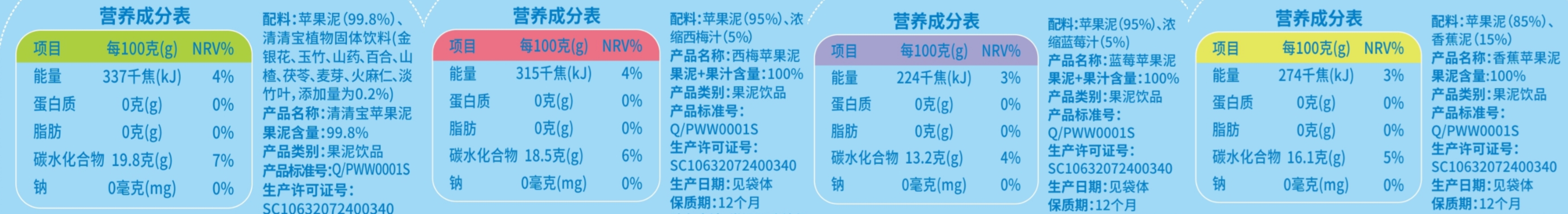 嬰尚果泥在以蘋果泥為打底的基礎(chǔ)上,推出了四種口味,滿足對不同營養(yǎng)素的需求:
