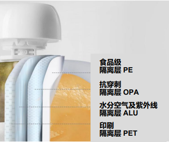 嬰尚果泥采用四層鎖鮮包裝(食品級隔離層 PE、抗穿刺隔離層 OPA、水分空氣及紫外線隔離層ALU以及印刷隔離層 PET),杜絕了氧氣和細(xì)菌,同時采用巴氏殺菌工藝,不添加防腐劑也能保鮮,最大程度保留了原材料的營養(yǎng)。